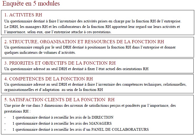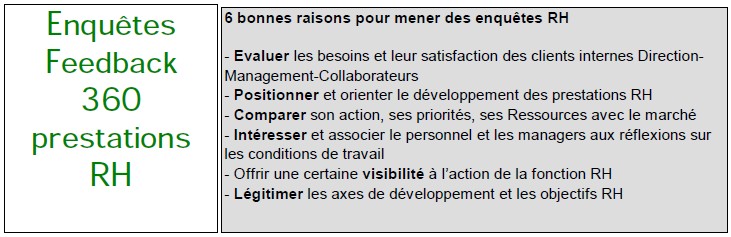 L’enquête feedback 360 des prestations RH complète cette lacune et offre, grâce à une analyse complète des activités, de la structure et de l’organisation RH, des ressources et des compétences, des priorités et des objectifs, et en fin de la satisfaction des clients de la fonction RH, une puissante base de travail pour la fonction RH. L’enquête permettra d’orienter de manière très précise la fonction RH, tant sur ces axes stratégiques de développement que dans ces activités opérationnelles.