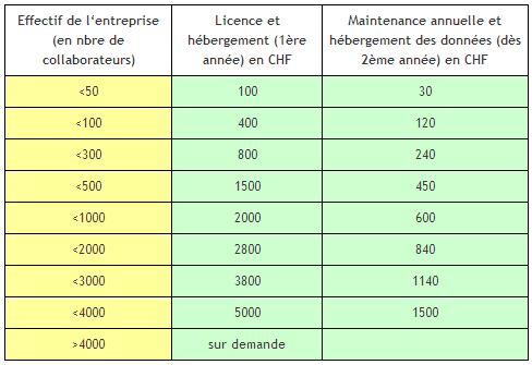 Les prix (HT) comprennent la licence, la maintenance et l’hébergement des données. La licence est valable sans limite de temps. Seul un renouvellement pour la maintenance et l’hébergement des données est facturé chaque année à un prix HT correspondant à 30% du total. Les prix sont déterminés en fonction de la taille de l’entreprise en nombre de collaborateurs (effectifs). Une licence permet un accès de 1 à 5 postes de travail selon la taille de l’entreprise.