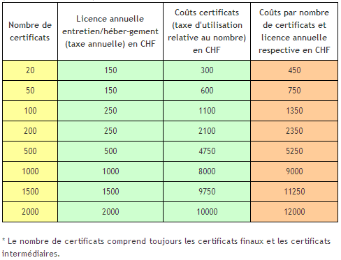 Nombre de certificats Licence annuelle entretien/héber-gement (taxe annuelle) en CHF Coûts certificats (taxe d'utilisation relative au nombre) en CHF Coûts par nombre de certificats et licence annuelle respective en CHF