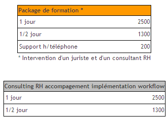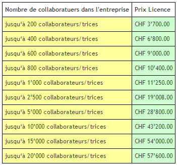 En cas d’achat du Manager de certificats de travail, le prix est déterminé en fonction du nombre de collaborateurs dans l’entreprise (effectif ). La taxe unique comprend une utilisation illimitée de l’application ainsi que le droit à des mises à jour gratuites sur chaque nouvelle application durant 4 ans (sans l’installation).